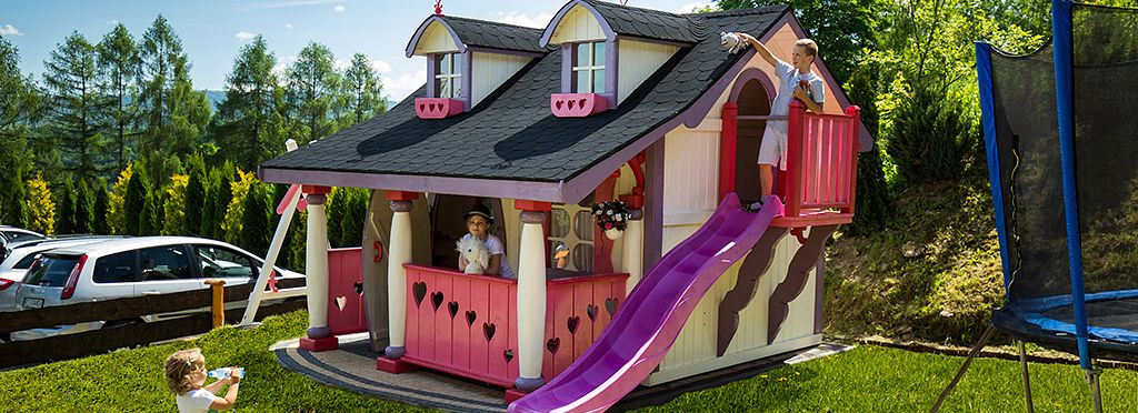 Dla naszych najmłodszych Gości przy domku najniżej położonym znajduje się ogólnodostęplny plac zabaw z bajkowym domkiem ze zjeżdzalną i zabawkami
